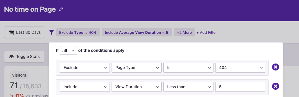 - Is the traffic suspicious? Many 404 requests come from bots scanning your site. If the requests are clearly malicious or irrelevant, you can simply exclude them from tracking.